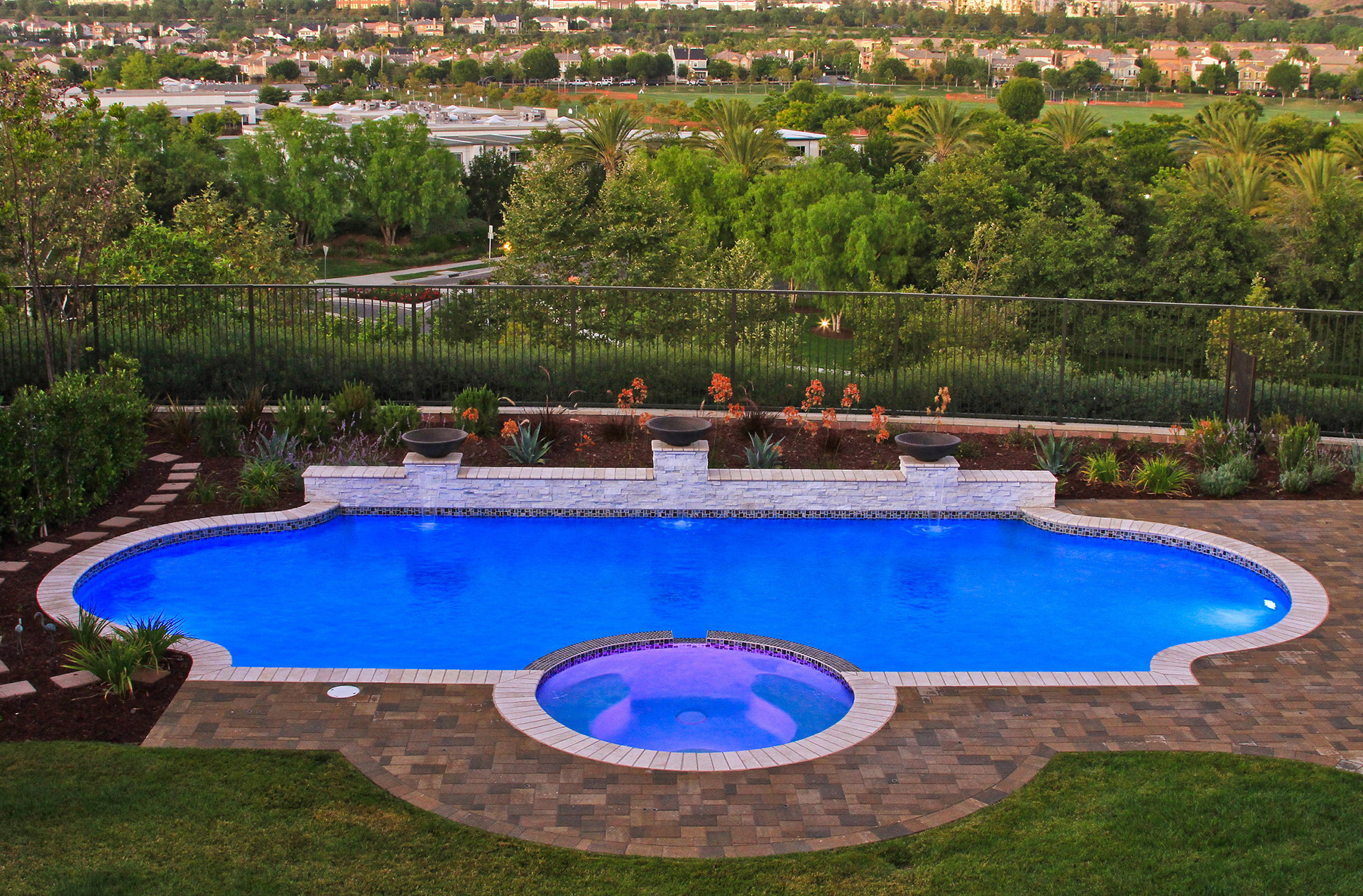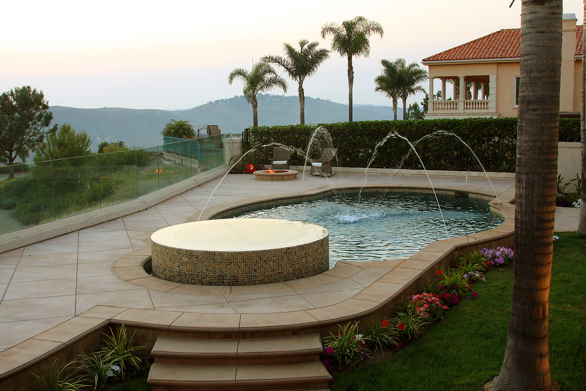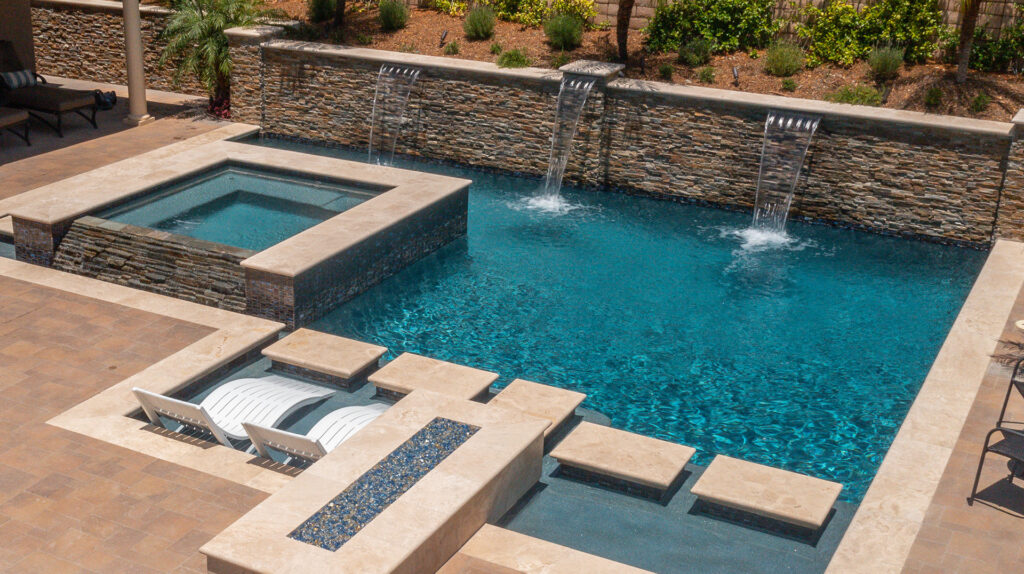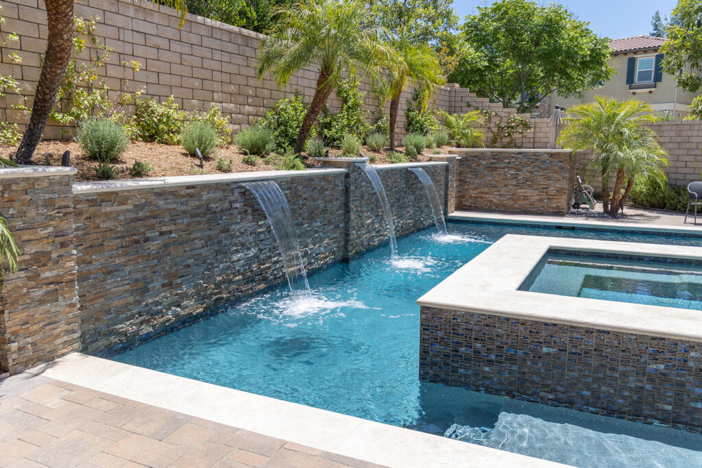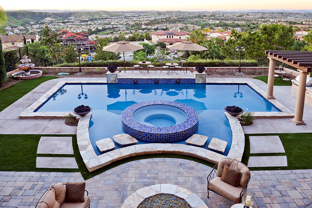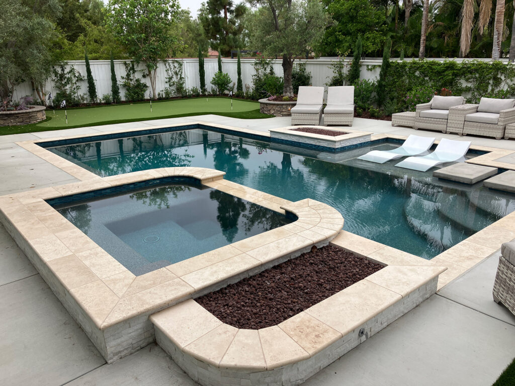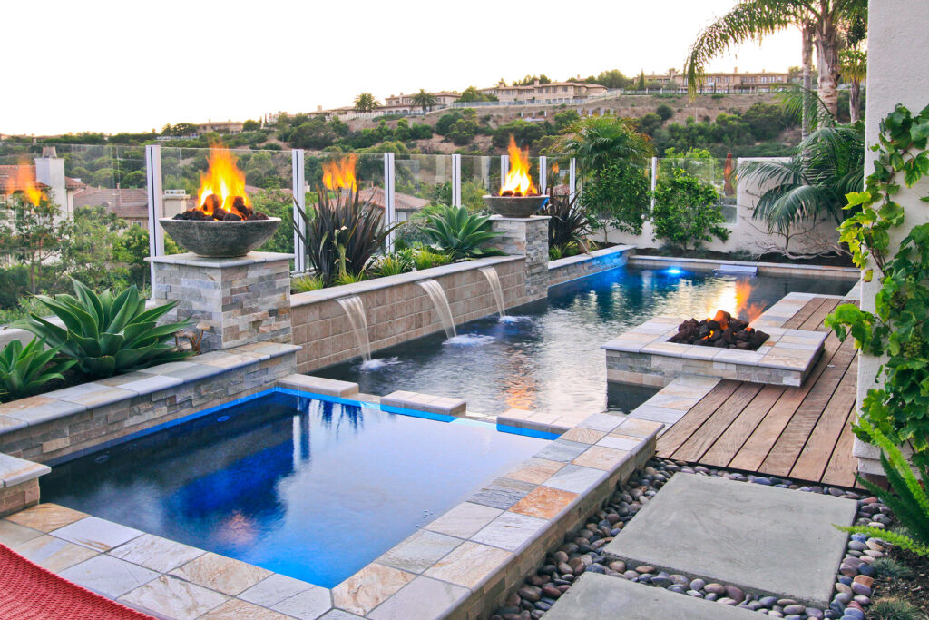 Infinity edge spa and a playful swimming pool with 4 deck jets performing a delightful water show in Laguna Niguel, California. The deck jets are in the separate pour stegmeier coping which is a San Diego Buff color. The raised spa and water line are veneered in artistic tile called Quartzite STXLPINWHEEL. the grout is a custom Pearl color. The plaster is Tahoe Blue Pebblecoat. The decking is Yosemite Brown, 3’x3′ scored and a brush finish. All wall veneer and around the fire ring is a Durango stone, Noche Honed. The playful yet elegant backyard oasis is completed with landscaping performed by Swan Landscaping.