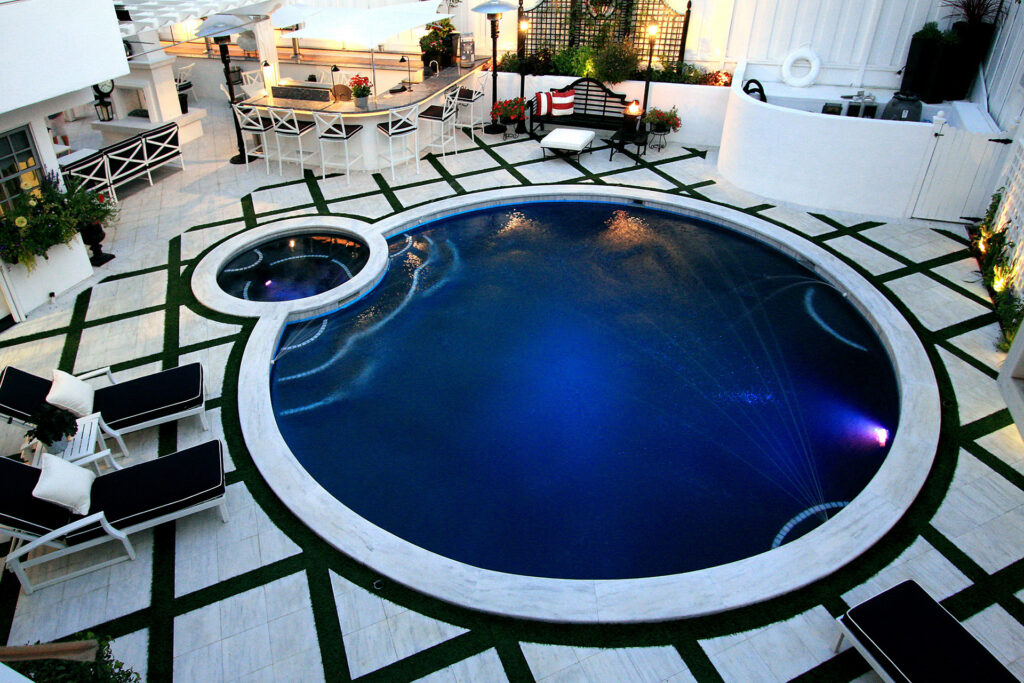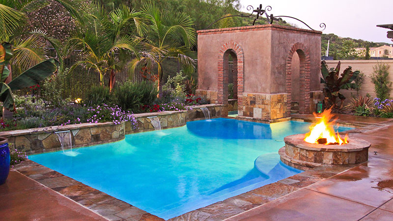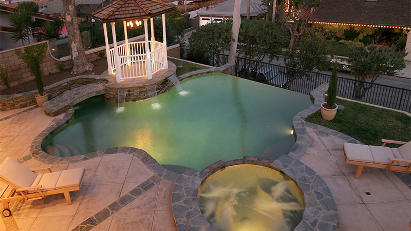 Fall in love with your backyard! This Newport Beach property went from small to charming – embracing the look and feel of classic country living. The Infinity Edge pool adds depth to the yard’s dimensions, while the subtle lighting adds a sizable dose of romance. The spa is raised to enhance its place in the ensemble, and it sets an overall tone with Tahoe Blue Pebblecoat plaster and Red Mountain stone. But the most magical element? The lit gazebo, straight out of a Harlequin novel, and accented perfectly by a simple stone bridge.
