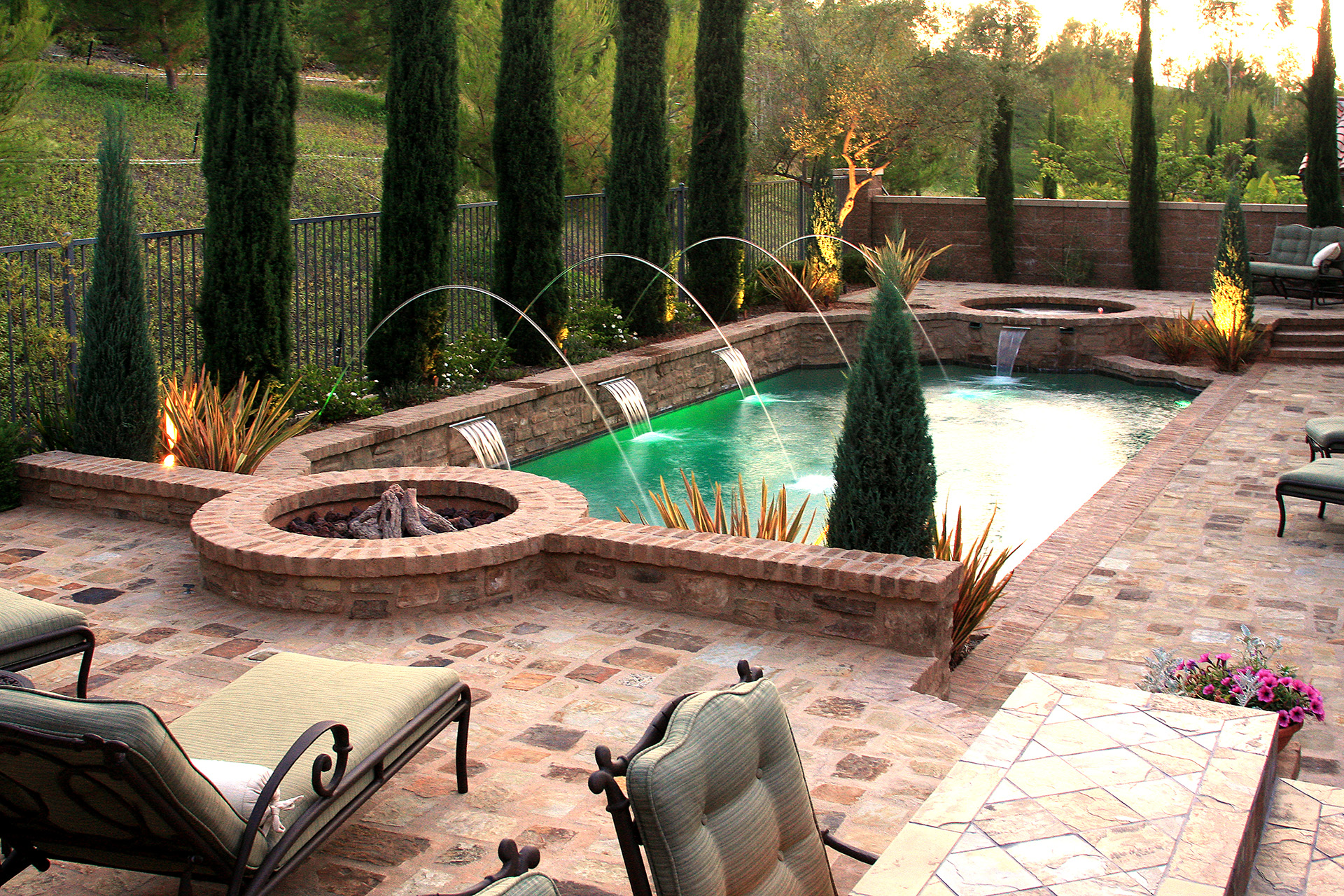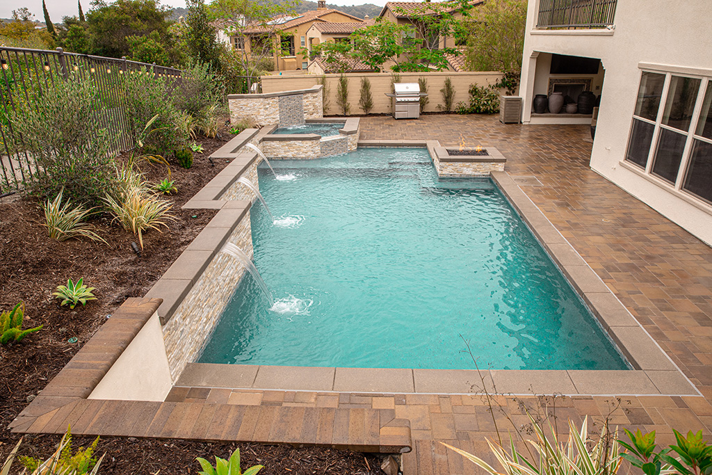 This backyard environment was styled after a classic grecian theme complimenting a newly remodeled 1940’s circa mediterranean villa in Newport Beach. Winning Gold at the APSP International Awards of Excellence, this environment is designed for entertaining a large, extended family highlighted with separate pour cantilever coping in a “Swoop” style for relaxation in the centered spa. Nestled next to a real wood fire pit, this pool has 3M Blue/Green Color Quartz crystals mixed with gray plaster and soft varying colors from the Jandy Digital Color pool and spa lights. With the two custom brick pilasters and the relaxing sounds from the three Sheer Descent water features along the 18″ Raised Bond Beam, one feels like they are whisked away to the Greek Isles.