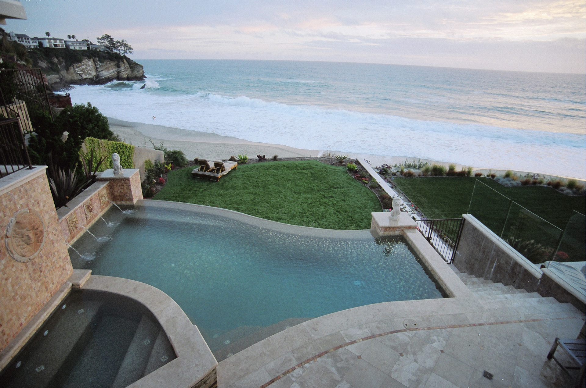 A delicate grecian resting place with elegance whisking one away from the hilltops of Newport Beach, California to the hilltops of the Mediterranean of old. Precast concrete coping stones. Pilasters built into pool beam. Raised spa and +18″ Jandy Sheer Descents. Raised bond beam is veneered in tile. Stone decking.”