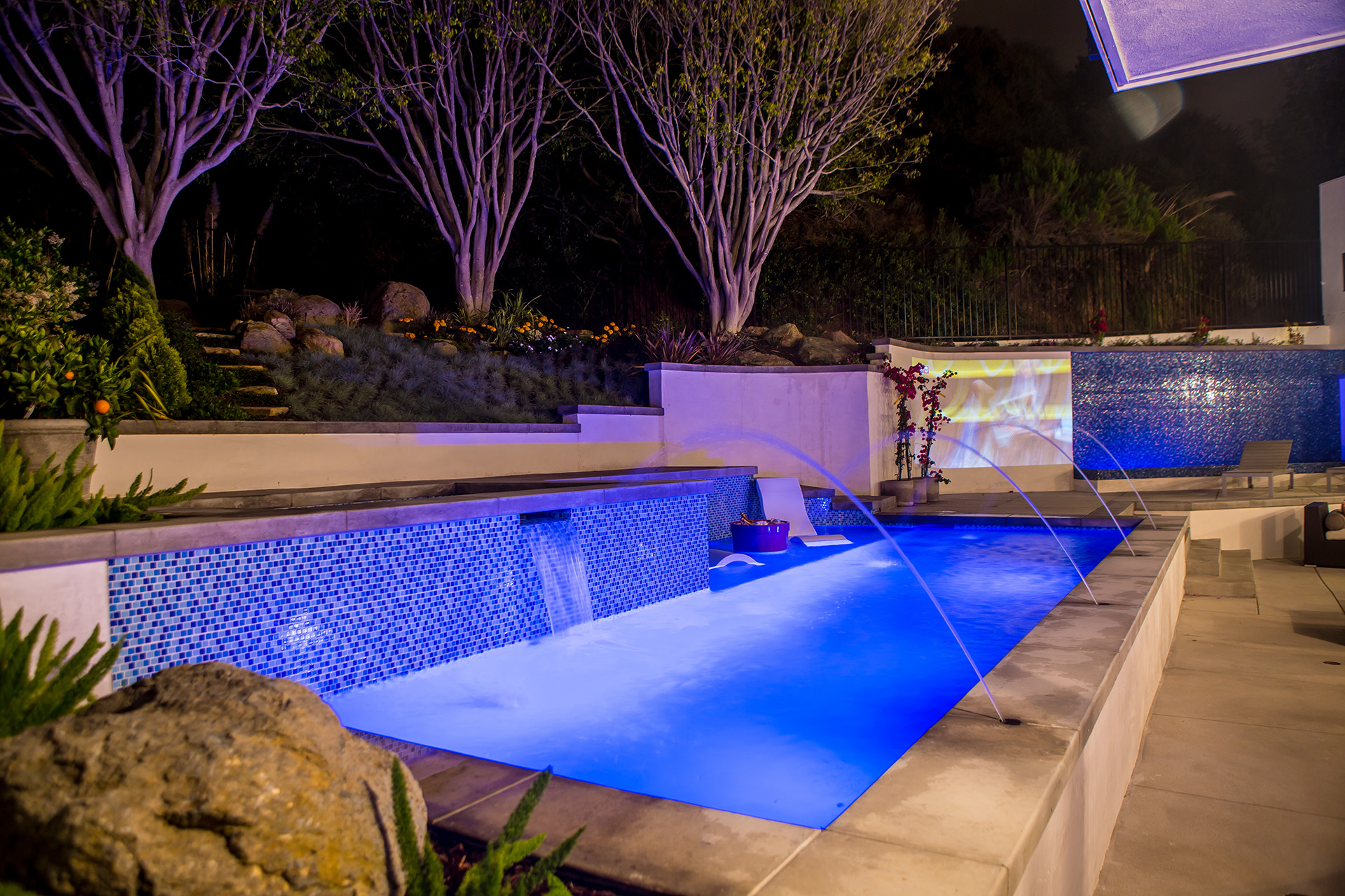 A Laguna Beach backyard tucked away in the slope with a 7’ Retaining Water Wall. This water-features connects to the plumbing of the pool in a single filtration system. A wonderful entertainment space to accommodate special events, family events, and even a relaxing setting is available with lighting controls and iAquaLink remote systems. This custom swimming pool backyard may perform as a Las Vegas sportsbook or, an evening with wine for two.