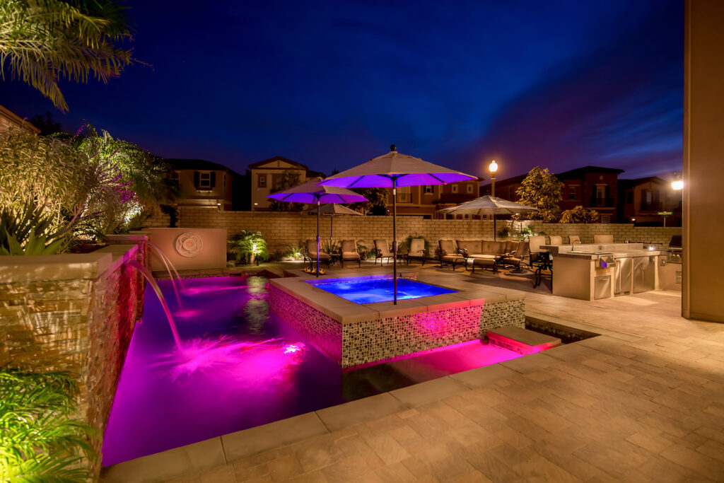 Elegance, class, entertaining, or simply lounging on the shelf doing what you do. This swimming pool and spa combination is nestled in a left, rear corner of the residence. Taking advantage of the side yard is a nice firepit area adjacent to the raised spa for conversation and laughter as well as a BBQ entertainment area in the main portion of the swimming pool including entry shelf and lounge design. This particular pool has separate pour concrete for coping with a finish to bring out the aggregate. A mini-pebble plaster coating and trim tile with 1×1 tiles to finish along the waterline and Raised Bond Beam areas. Also visible are Jandy Sheer Descent Water Features and Ledge Loungers, that we are an exclusive partner with, for that finishing touch. And in conclusion, it’s on a remote system that you may operate from an App on your Phone or any device.