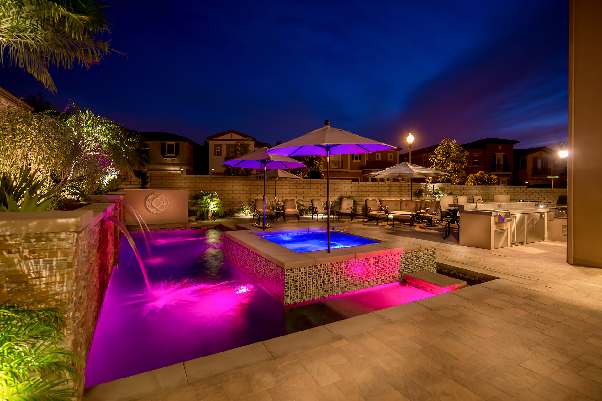 Gentle waterfalls and lounges encompass your raised spa secretly realigning your energies; recovering you from the day. Tucked away your private spa is awaiting you in your backyard to welcome you home.
