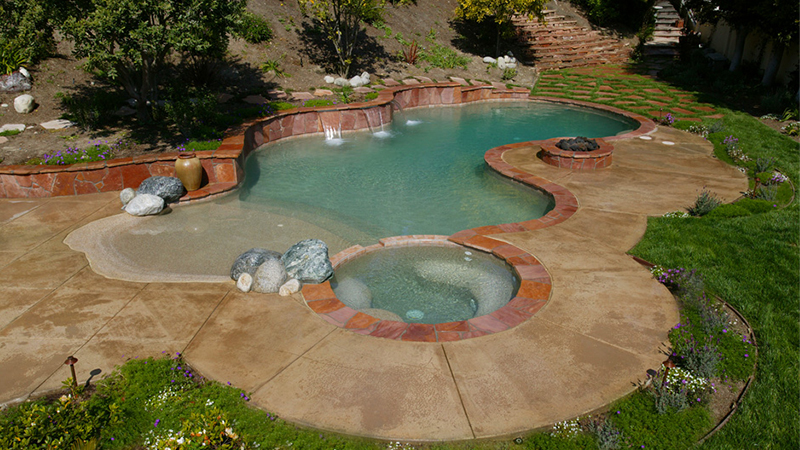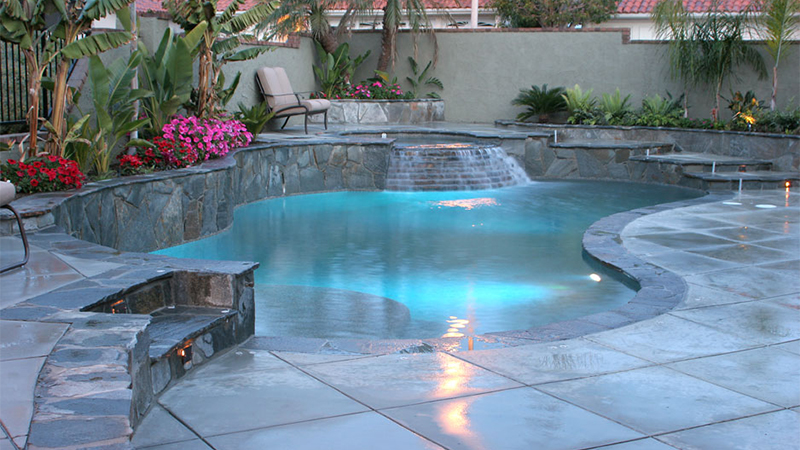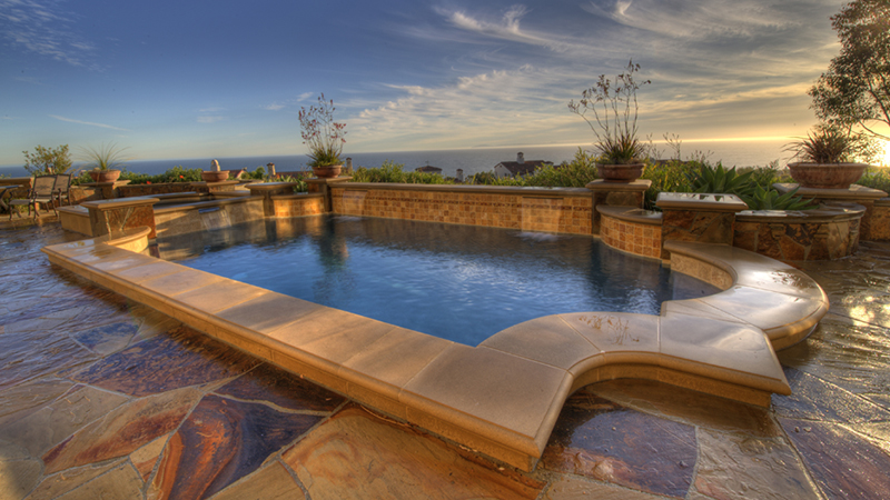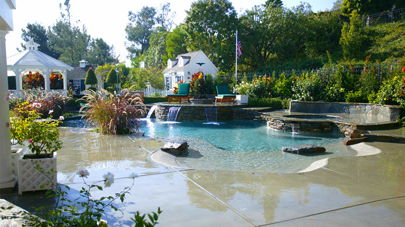 A NSPI Silver Design Award winner, this Laguna Niguel home was blessed with a generous, open space protected by a steep hillside. Broad, sweeping walkways and stone risers subtly break the islands housing the spa, sun deck and fire pit. A gently sloping beach entry and understated waterfalls suggest a tropical lagoon. The pool area is accented with several varieties of stone, natural brushed concrete and blue Pebblecoat, and finished with Swan landscaping.