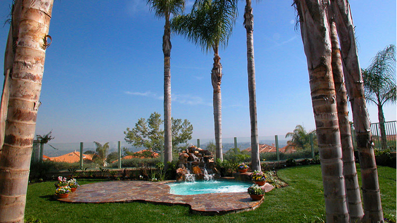 This intimate creation was inspired by the natural majesty of a palm grove in the corner of a Laguna Niguel property. Great columns of trees frame a waterfall of real stone, cascading into an organically shaped spa surrounded by Three Rivers stone hardscape.