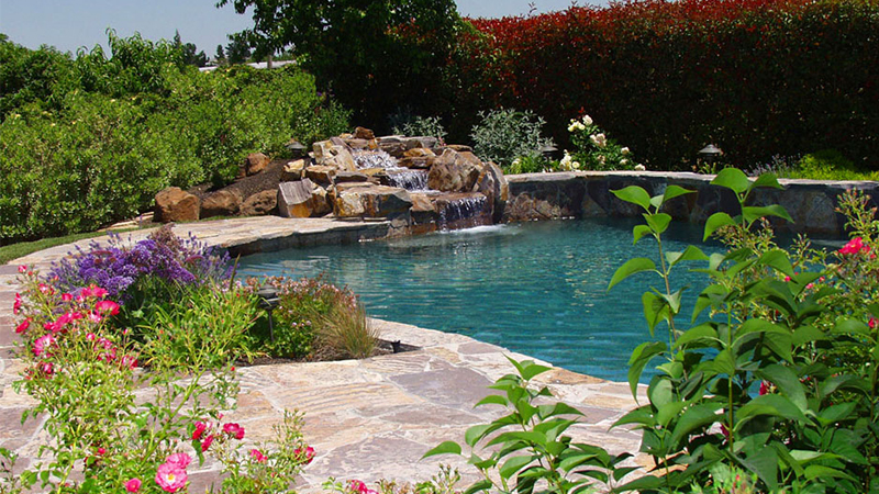 Here, we are inspired by the classic swimming hole. Sculpted with generous quantities of genuine Red Mountain river rock and surrounded by irrigated planters, this Stockton property has the look, the feel and the sound of a riverside hollow – a pool that Huck Finn might have designed.