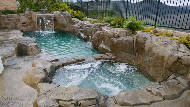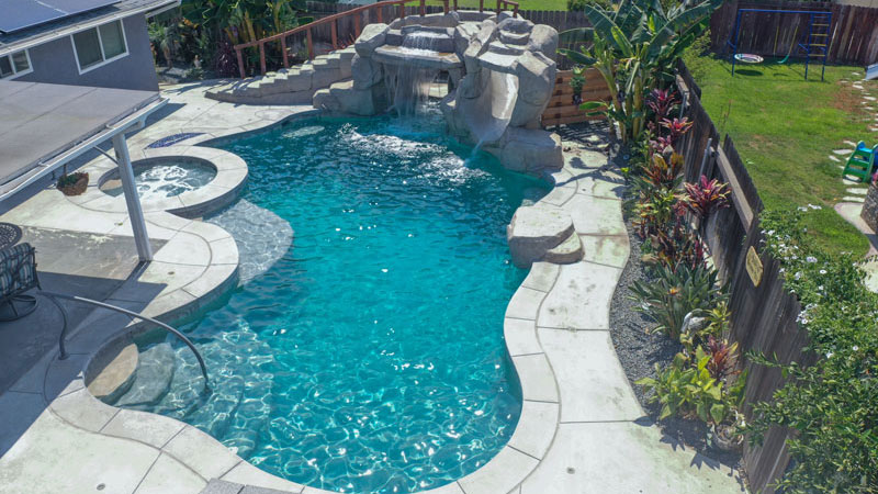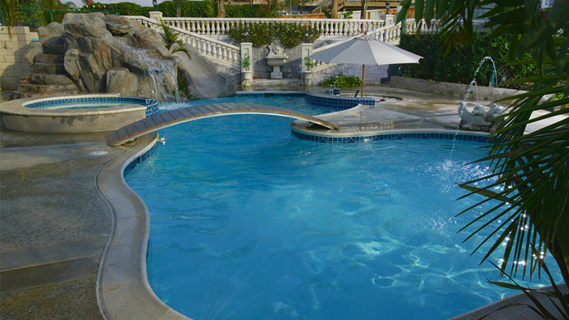 A unique project in designing for the entire family with spacial concerns and utility easements. Swan Pools ‘Complete Family Fun’ design incorporates two safety railings in the swimming pool entry and spa respectively for assisted entry. The swimming pool is plaster with a mini-pebblecoat for traction and durability. There are several swimming pool seats or swim-outs for use. And the grotto, waterfall, and swim-out is fun to get out, climb up the stairs with faux-natural railing, and plunge the pool in an artificial rock slide even with a waterfall splash over effect like a water-park. All portions of the pool are controlled by a remote system so various zones maybe controlled and turned on only when desired. A Complete California Family Fun from Swan Pools.
