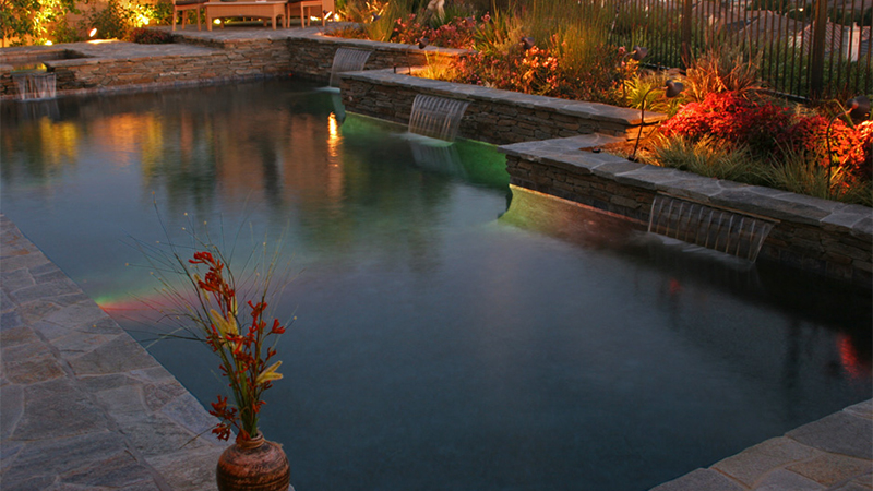 Here, a simple, sloping Laguna Niguel yard is transformed into a terraced paradise with an Asian influence. A blue Pebblecoat plaster creates two jewels in a sculptured setting of Red Mountain stone. Between them, a spillway fountain creates hypnotic sound and motion.
