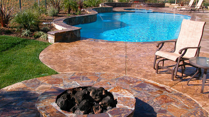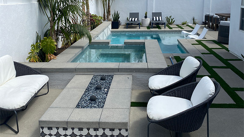 In this Tustin home, guests can wander between the warmth of a fire ring and the cool pleasures of a spa and pool, walking across a stone deck to concrete surfaces with stamped and natural, brushed textures. Organic architectural shapes are complemented by a casual Swan Pools landscape design.
