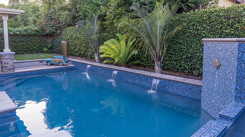 This is a very elegant swimming pool and spa combination with a homeowner flair. Any Californian knows the fun in a Classic Woody car. This Swimming Pool has a descent area for the kids and fun for the adults as well as integrating into its surroundings. The equipment is behind the Raised Bond Beam while still meeting City Building Codes as well as Standard California Building Codes. There are Jandy Sheer Descents water features and it is lined with a Quartz additive plaster. 1×1 tiles give the waterline and Raised Bond Beam a ‘pop’ in look.