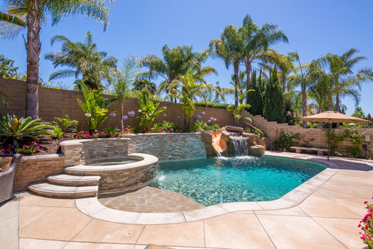 Feast on a taste of the tropics, while maintaining a sizeable space for eating, entertaining, or just plain living! This Mission Viejo landscape combines Natural Casa Loma concrete with Red Mountain Stone coping – offering both exotic ambiance and modern artistry. The raised spa is accessible by stone steps, and boasts a unique Rip Rap water feature to emulate a streaming waterfall. The open layout monopolizes on natural light, creating the perfect outdoor setting to capture our sunny SoCal weather.
