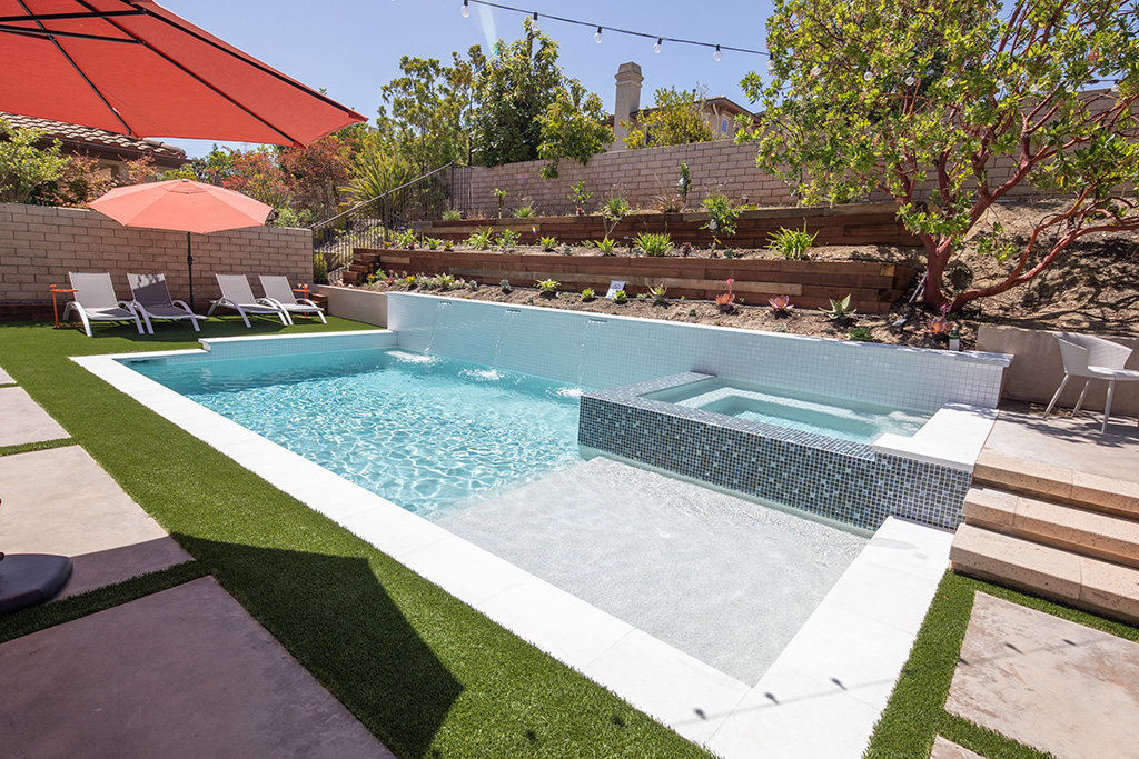 An enjoyable Southern California backyard transformed into a breath taking California Oasis for Everyone. Utilizing existing conditions and the slope, Swan Pools used portions of the custom swimming pool construction as a retaining wall by creating a Raised Bond Beam tied into the structure of the pool. California Outdoor Living. New rectangular swimming pool construction with raised spa. The raised sun deck area with built in bench and fire-pit also performs as a retaining wall and matches the elevations of the pool Raised Bond Beam. Including water basin with plumbing tied into the pool system makes for an easy maintenance solution and an enjoyable environment. For the Family as well as Friends.